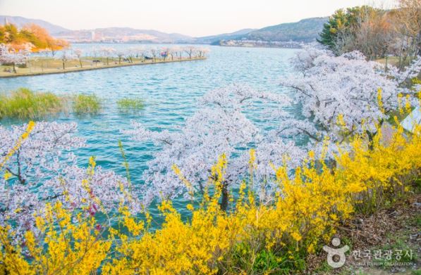 50만 평 규모의 넓은 호수를 감싸든 둘러싼 벚꽃 나무와 수양버들의 조합은 다른 어느 명소에 가서도 볼 수 없는 경치이다. 그리고 벚꽃 나무 아래로 산책로와 자전거도로가 나있어 가볍게 거닐기에 안성맞춤이다. 자전거 대여도 가능하고 호수에서 오리배를 타며 벚꽃 관람까지 가능하니 쉼 없는 재미를 선사해주는 벚꽃 명소이다.